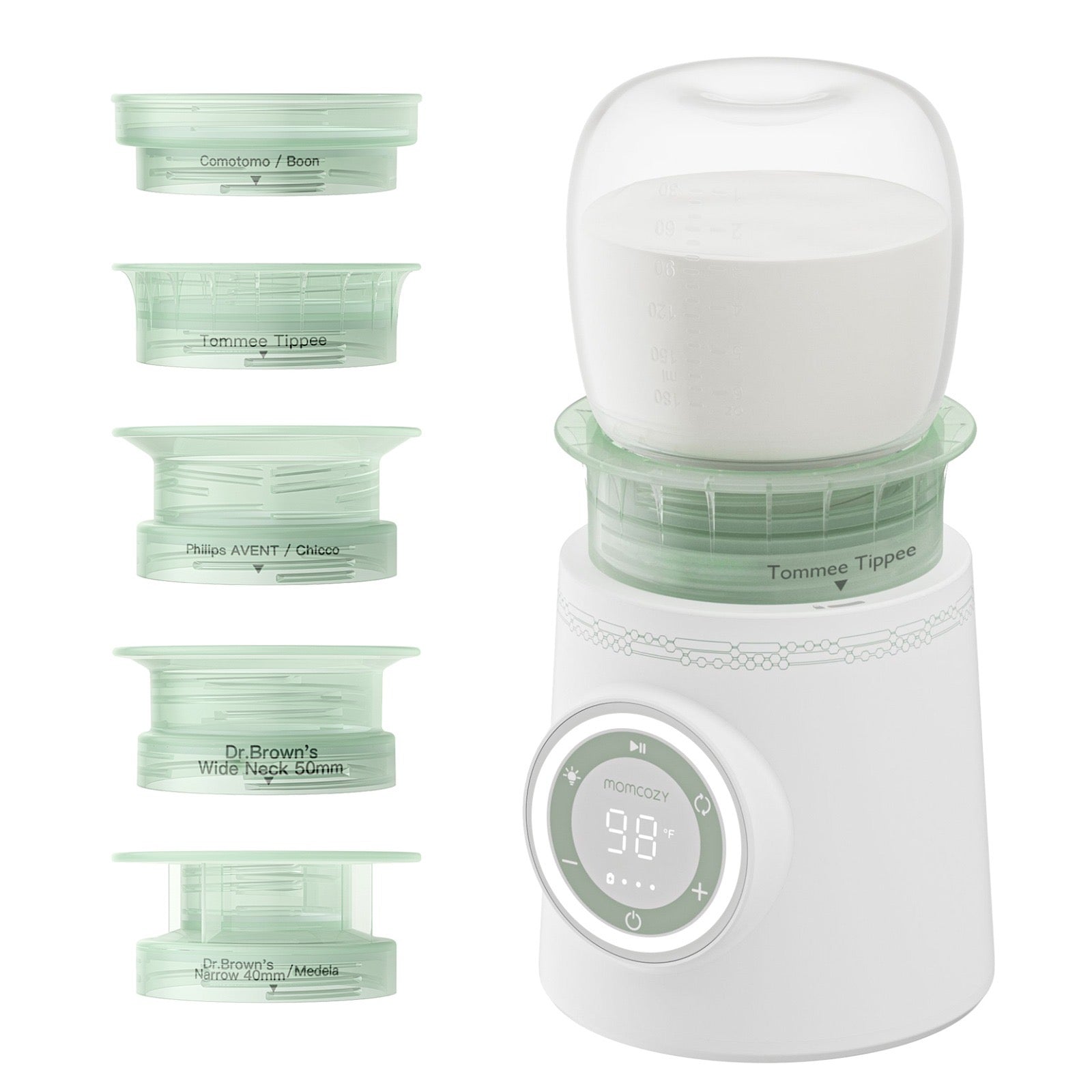 • Bashkues me shumicën e shisheve të njohura (Philips AVENT, Dr. Brown, Tommee Tippee, Comotomo, Chicco, Medela) – 5 adapterë të përfshirë